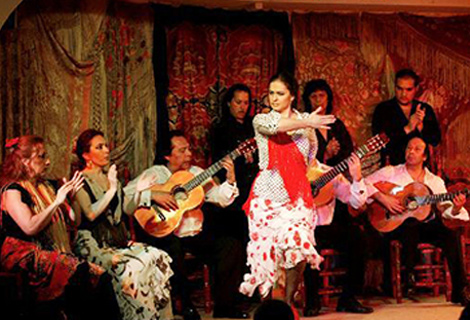 スペイン南部アンダルシア地方で生まれたスペインの伝統芸能です。 ダンサーの激しい足さばきと手指の柔らかな動きが有名ですが、本来は歌から発展し始め、その後身近にあったギターなどが加わり、現在のような形になりました。 19世紀頃には「カフェ・カンタンテ」と呼ばれるライブ酒場がスペイン全土に広がったことで全国的にポピュラーになり、2010年にはユネスコ無形文化遺産に指定されるなど、世界的にもスペインの代名詞となっています。