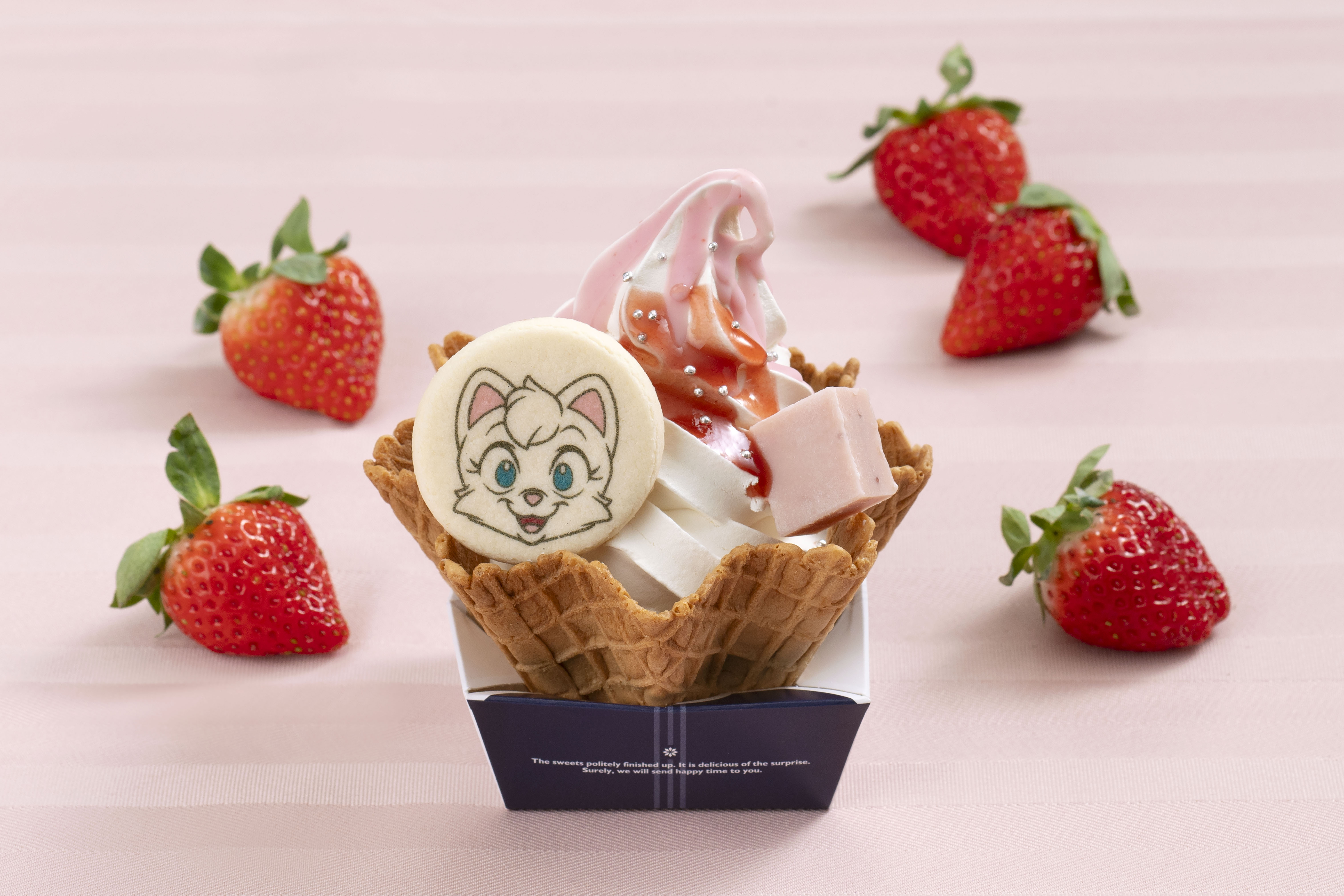 バニラソフトに2種類のストロベリーソースと、いちご味の生チョコ、ダルシネアのクッキーをトッピングしました。