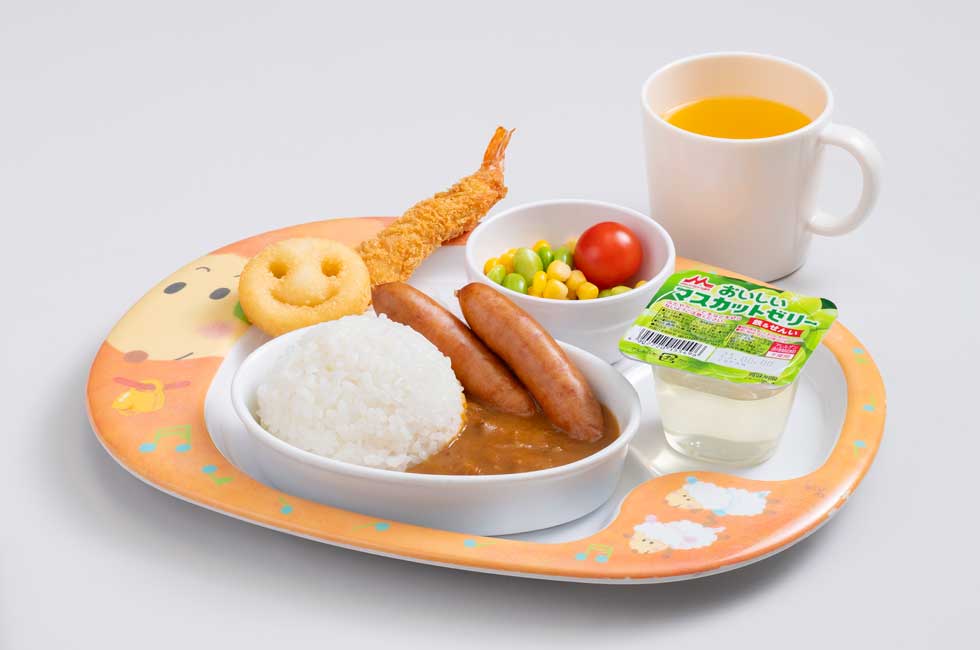 ソーセージカレー、エビフライ、ポテト、ミックス野菜、マスカットゼリー、ソフトドリンク(オレンジ)