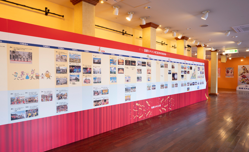 2024年に30周年を迎えた志摩スペイン村。開業以来の歴史や、30周年アニバーサリーイヤーに実施したイベントの紹介などを展示でお楽しみいただけます。