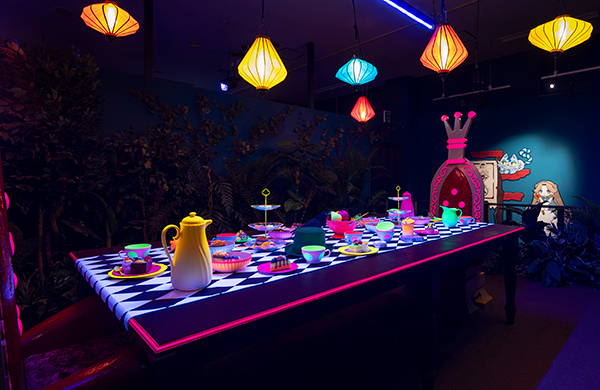 不思議な森やバラの庭園、ティーパーティー会場など、ちょっぴりダークだけどワクワクがいっぱいの不思議の国を歩いて楽しもう。