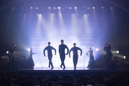 鉄製の足場や冷たい光の照明も印象的で、伝統的なフラメンコと現代のアンバランスな世界観が観る者を引き込んでいきます。