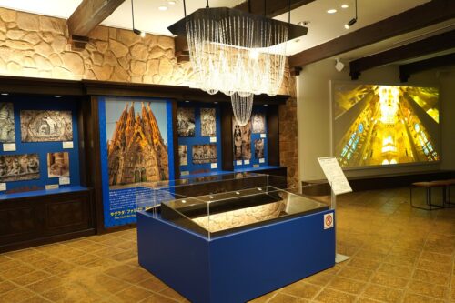 アトリウム横の展示室には、世界遺産にも登録されてる「降誕のファサード」の彫刻の解説パネルや、ガウディが教会の構造・デザインを構想した「逆さ吊り実験」の模型など、ガウディの建築をより理解できる内容を展示しています。
