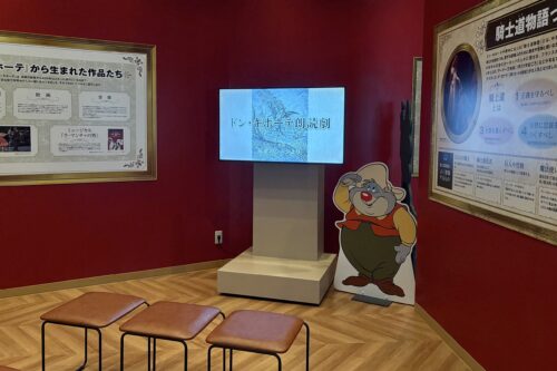 このコーナーではパネル展示や、ドン・キホーテが風車に向かって突撃していく有名なシーンの朗読劇の映像などで、物語の世界観をお楽しみいただける展示室になっています。