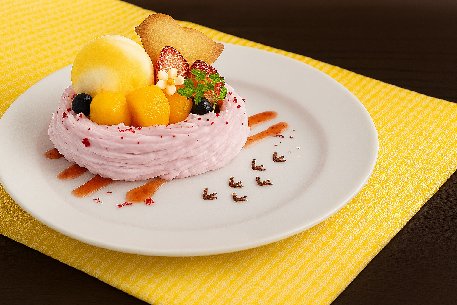 パンケーキにいちごホイップを絞り、鳥の巣に見立てました。卵型のマンゴーアイスとひよこクッキー、フルーツをトッピングして、春の訪れを賑やかに表現しました。